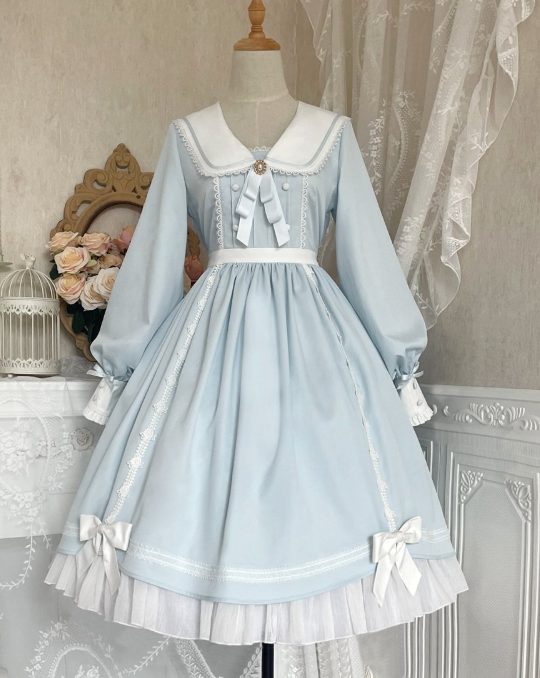 ふんわりとした袖と裾のフリルが特徴的な上品なワンピース。襟元や腰周りのリボンがアクセントに。胸元の大きな襟と繊細なレース使いが甘さを演出。