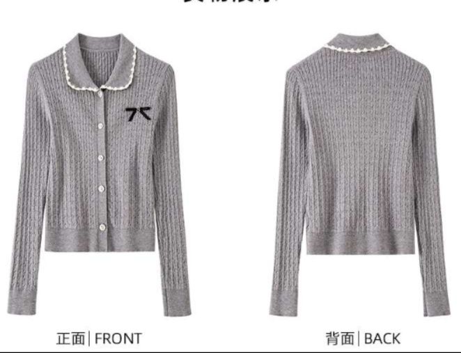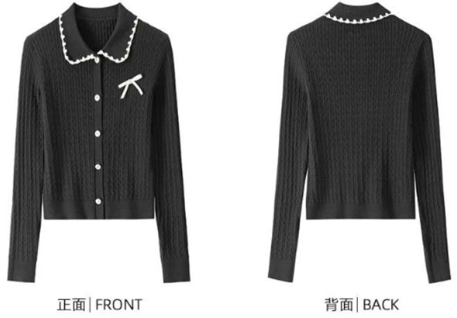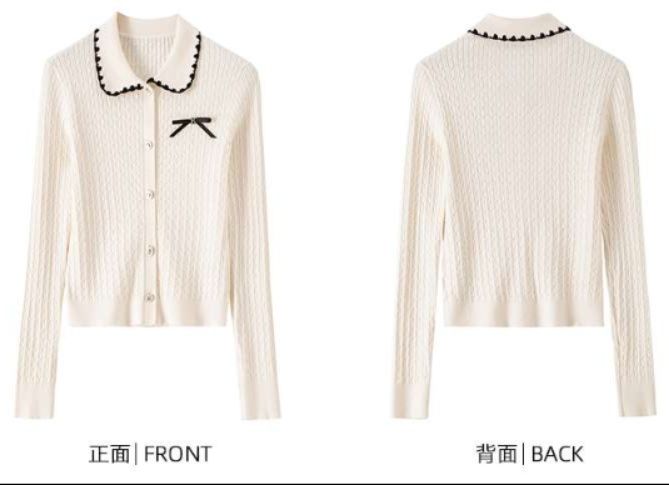 上品な丸襟とミニリボンがアクセントの長袖カーディガン。縦のケーブル編みで細見え効果あり。裾と袖口のリブ編みでシルエットを整え、襟元の白いパイピングが清楚な印象を演出する女性らしいデザイン。