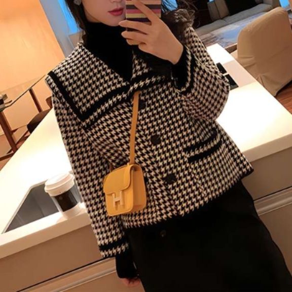 ほっそりとした襟元に黒のハイネックを合わせた上品なデザイン。大きな千鳥格子模様が特徴的なベスト風ジャケット。前開きのボタンデザインで着脱しやすく、シンプルながら華やかな印象を演出。