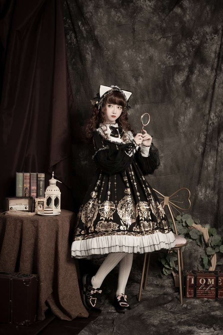 豪奢な装飾が施された胸元から裾まで広がるドレス。フリルの重なる白い裾飾りと、十字架や宮殿のような繊細な模様が特徴的。頭飾りの黒リボンが可愛らしさを引き立てる優美な一着。
