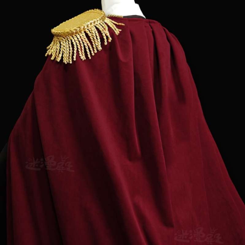 金糸の肩章と深みのある外套が威厳を放ち、層を重ねたスカートの裾には優美なフリルを配置。