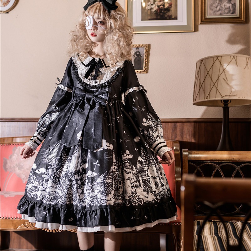 ロリータファッションの世界観を存分に楽しめるゴスロリワンピースです。 物語の一場面を切り取ったような幻想的な絵本柄が裾全体に広がり、少女や建物、花々が繊細に描かれています。 セーラー襟と袖口のフリルが可憐さを演出し、胸元の大きなリボンがアクセントになっています。 たっぷりとしたボリュームのあるスカートは優雅に広がり、重ね着風のデザインが立体感を生み出します。 特別な日のお出かけやイベントにぴったりの一着です。