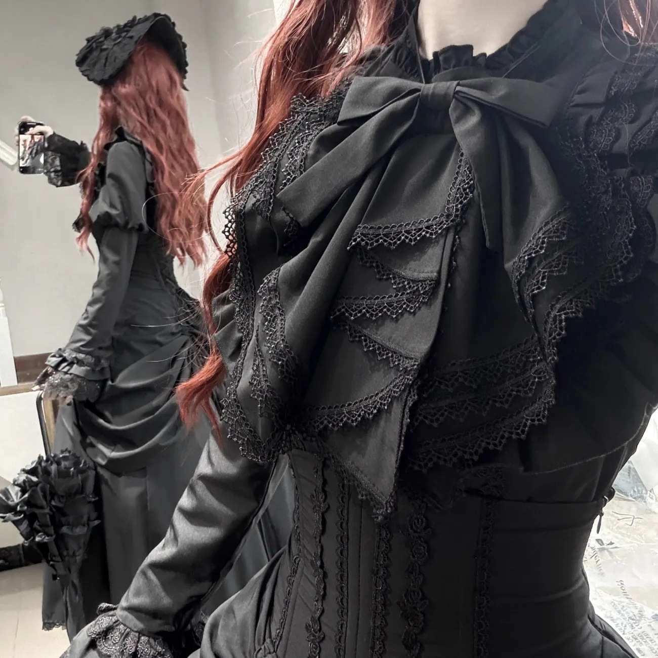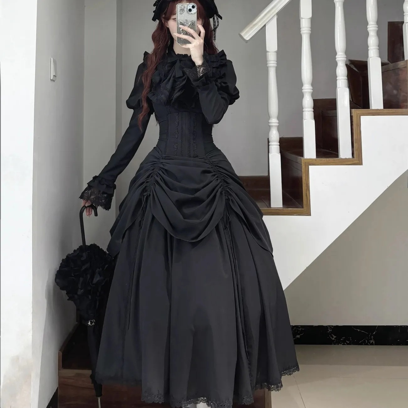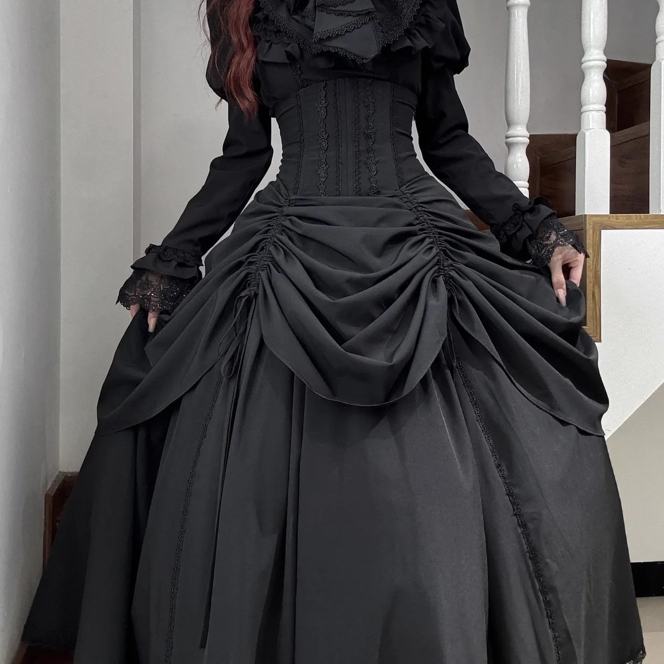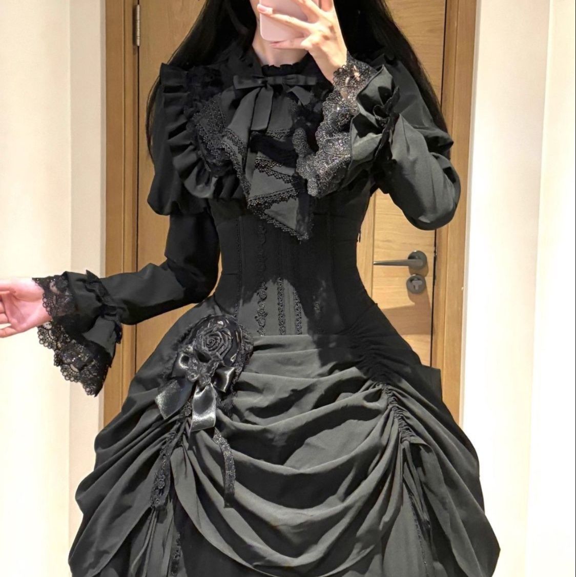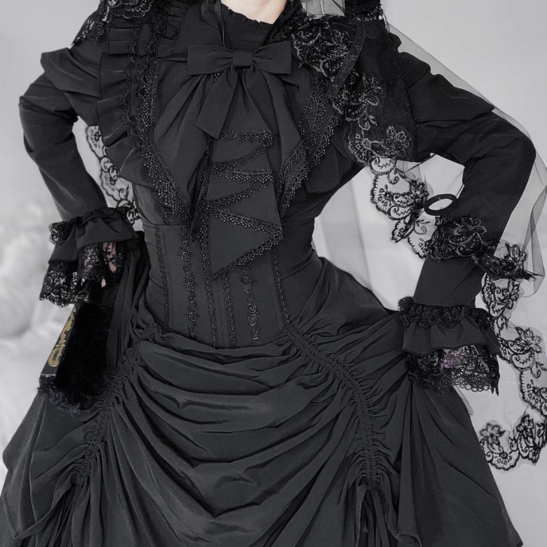 ロリータファッションの中でも本格的なゴスロリスタイルを追求する方におすすめの豪華なロングドレスです。 ウエスト部分には繊細な編み上げコルセットデザインを施し、美しいシルエットを演出します。 立体的なドレープとギャザーが贅沢に配されたスカート部分は、まるで中世の宮廷を思わせる優雅な広がりを見せます。 袖口と裾には繊細な総レースをあしらい、細部まで丁寧に仕上げた逸品です。
