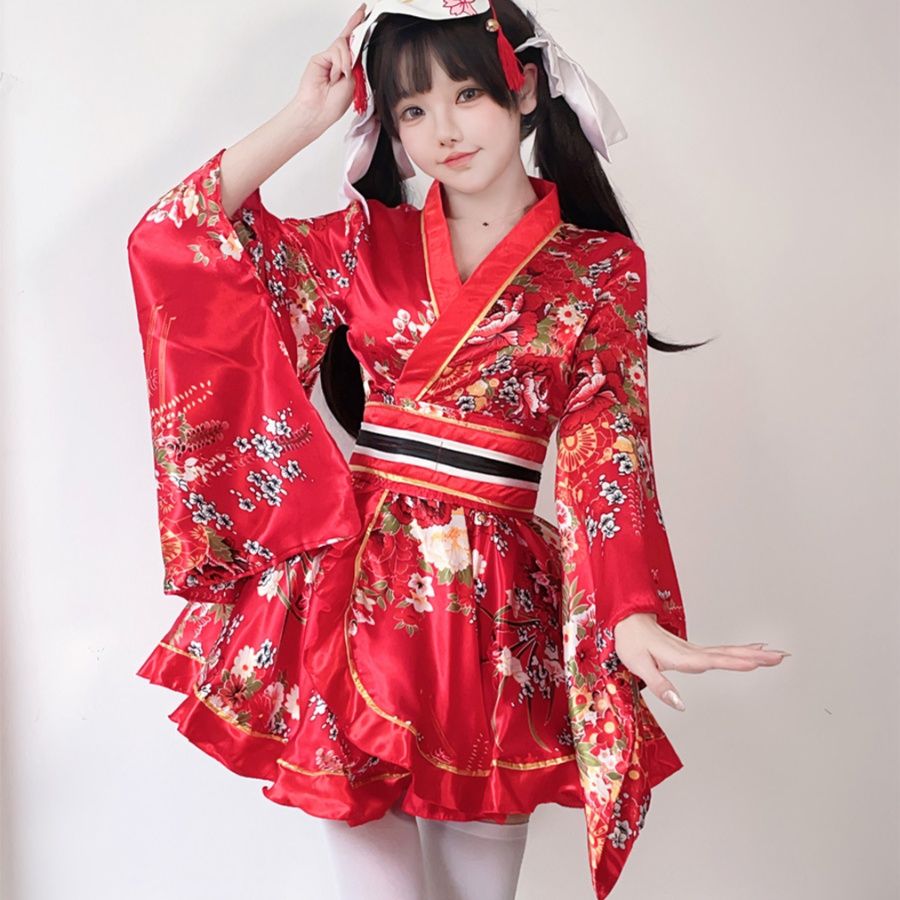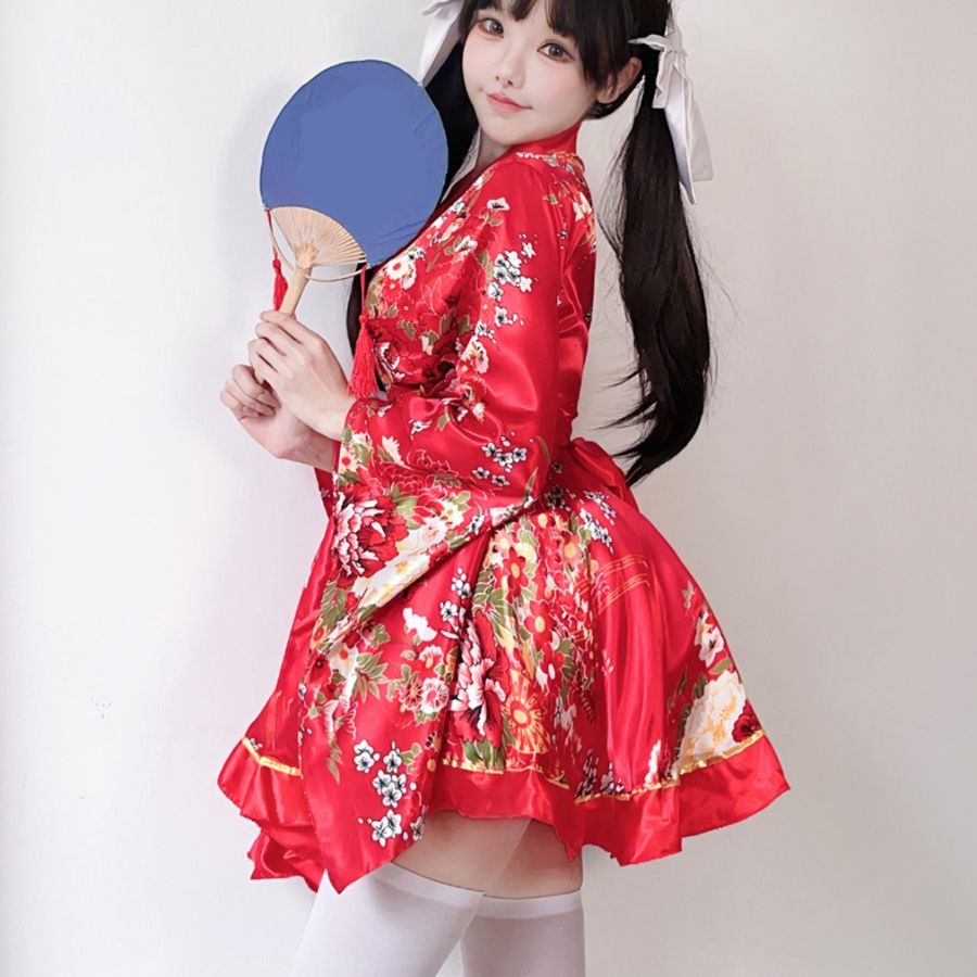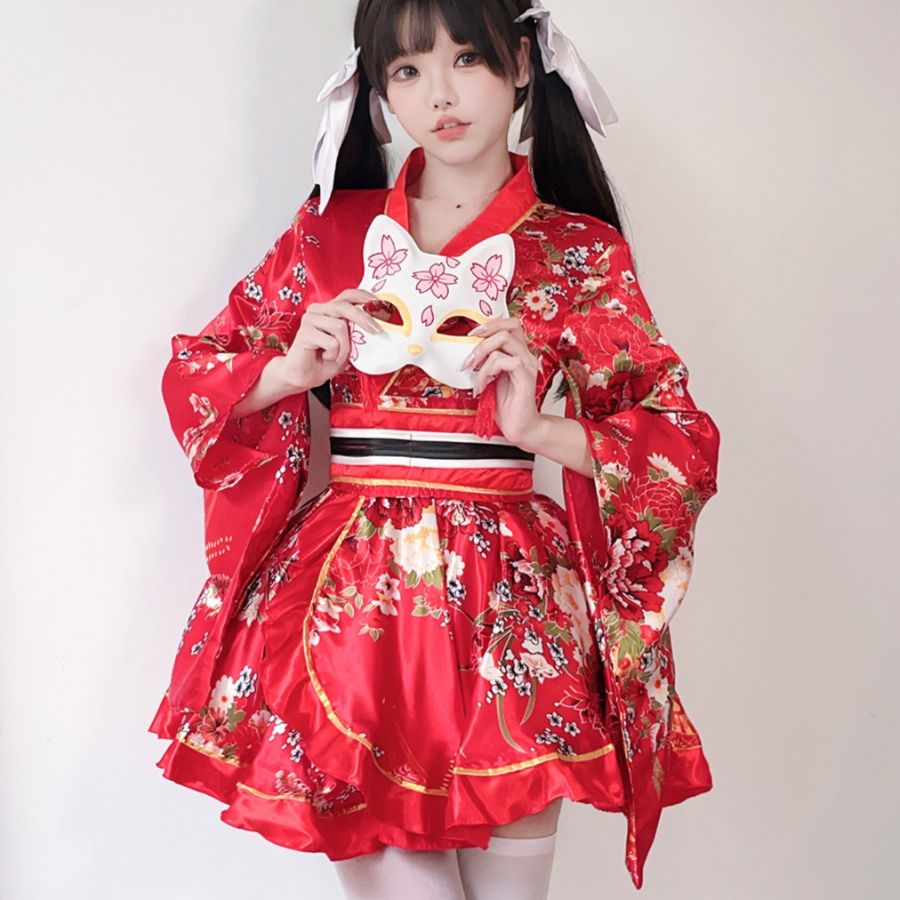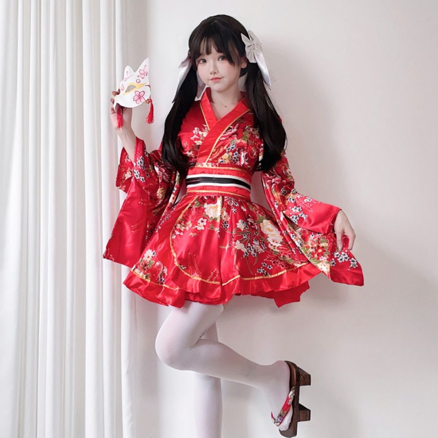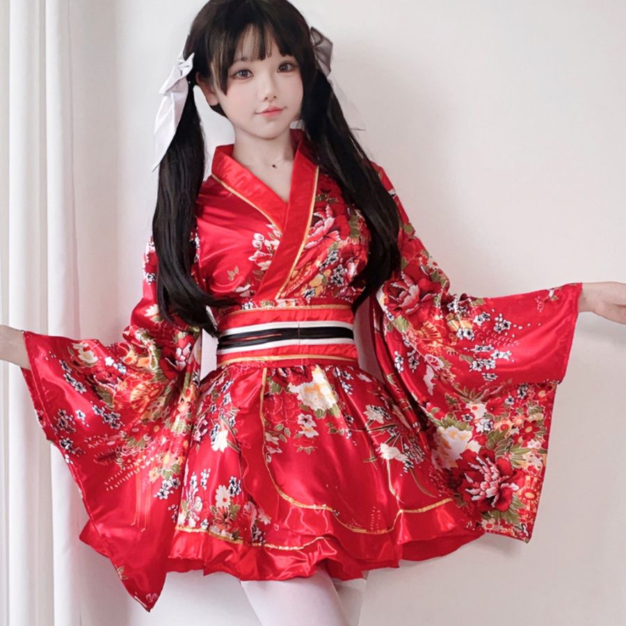 着物襟のデザインと幅広の帯風ベルトで和装の雰囲気を演出しながら、大きく広がる袖と短めの丈がロリータらしい愛らしさを表現しています。