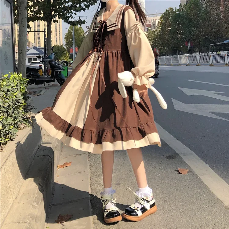 大きなセーラー襟とパフスリーブが可憐な印象を演出し、胸元の編み上げ装飾がアクセントになっています。