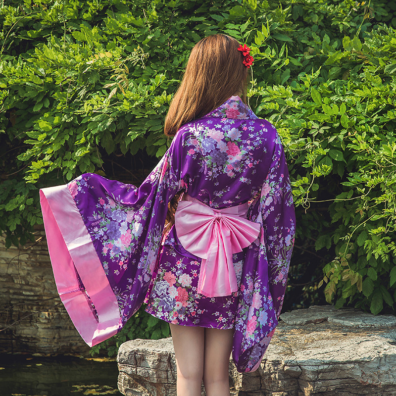 花柄が全体に散りばめられた着物風のデザインに、背中の大きなリボンが愛らしさを演出します。