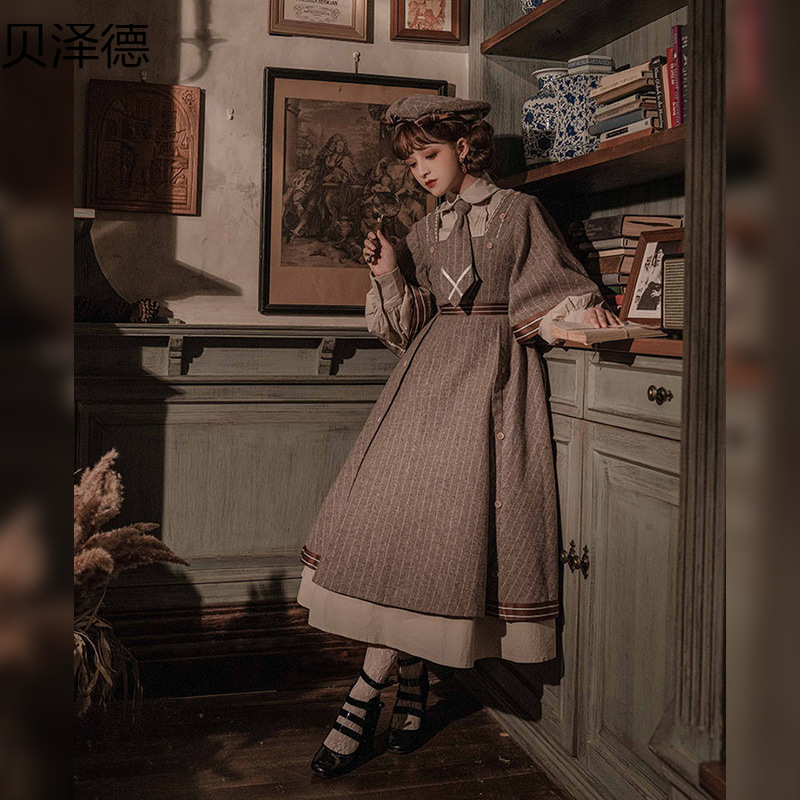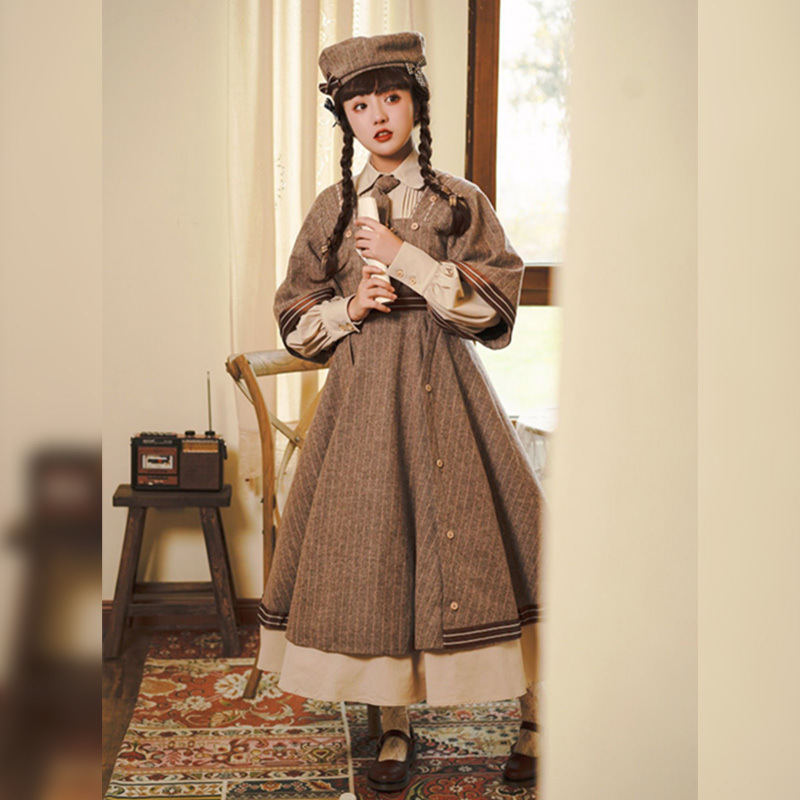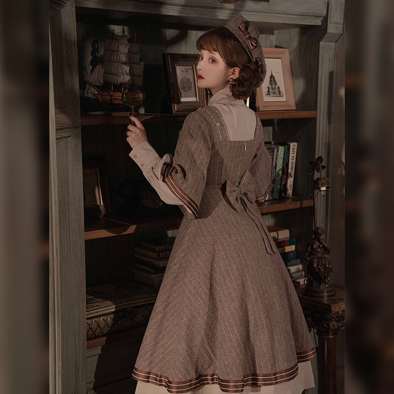 クラシカルロリータの魅力を存分に詰め込んだ、ミステリアスな雰囲気漂うワンピースセットです。 丸襟のブラウスと縦縞柄のベスト、ふんわりと広がるスカートが織りなす上品なシルエットが特徴的です。 ロリータファッションらしい可憐さと知的な探偵風の雰囲気を併せ持ち、袖口のリブニットや裾の配色切り替えなど細部までこだわった仕上がりとなっております。 物語の主人公になったような気分を味わえる一着です。