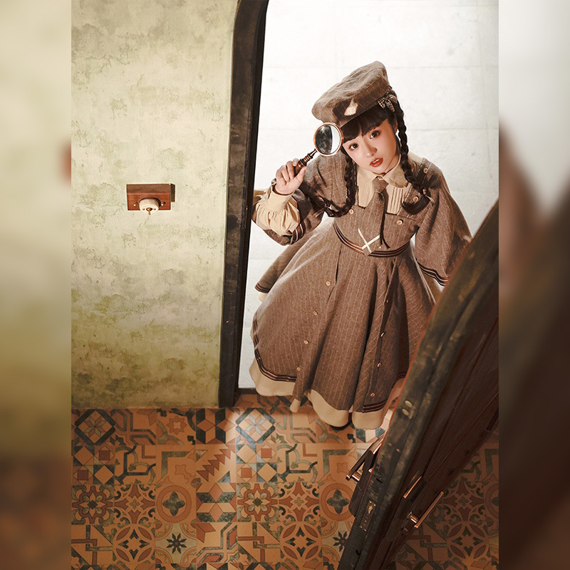 ロリータファッションらしい可憐さと知的な探偵風の雰囲気を併せ持ち、袖口のリブニットや裾の配色切り替えなど細部までこだわった仕上がりとなっております。
