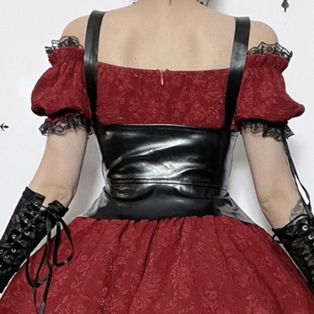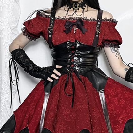 肩から腕にかけてのオフショルダーデザインと、ウエストの編み上げコルセットが美しいシルエットを演出します。