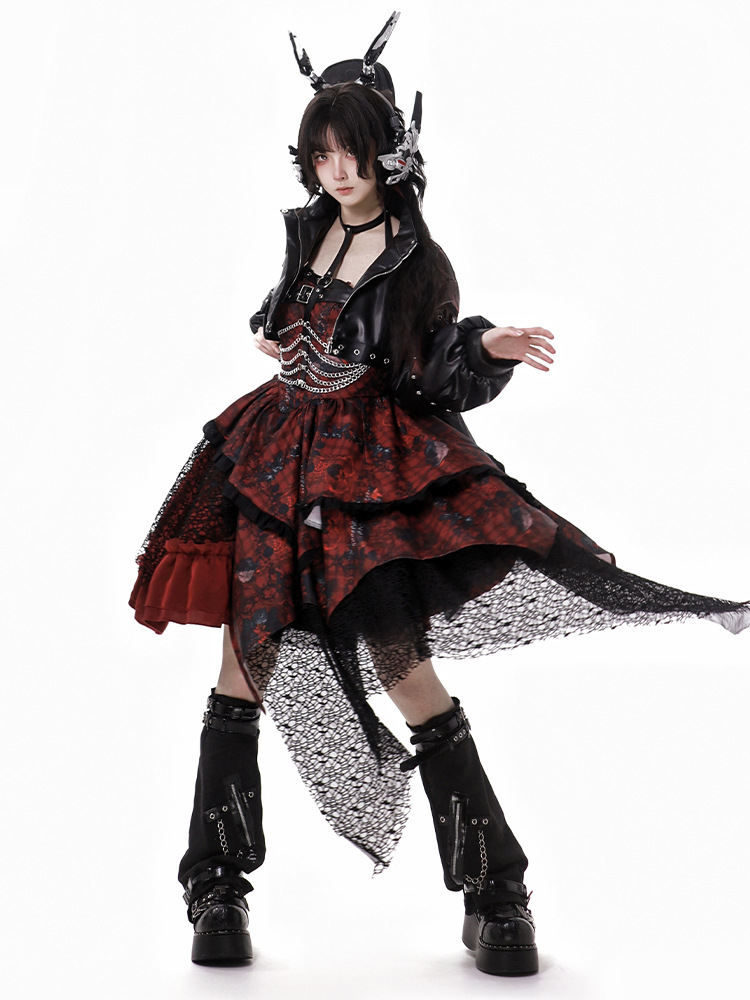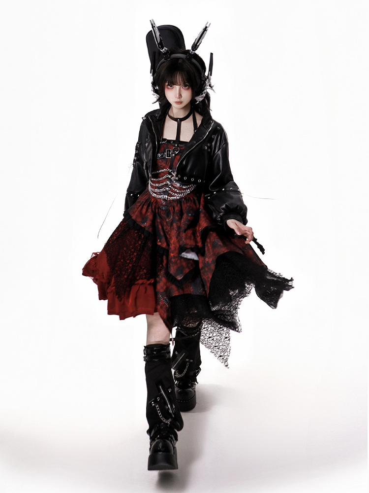 胸元の鎖飾りと金属パーツが機械美を演出し、不規則にカットされた裾のレースが動きに合わせて優雅に揺れます。