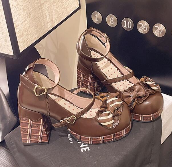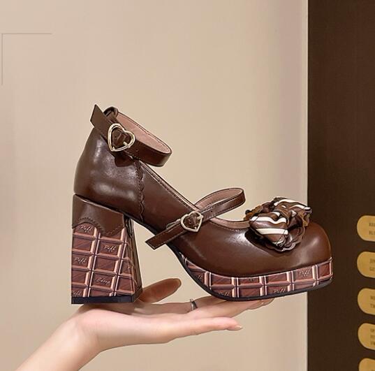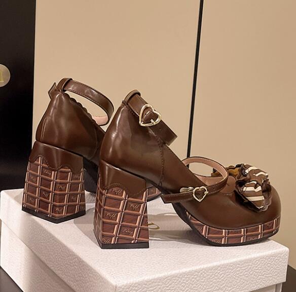 甘いチョコレートをモチーフにした可愛らしいリボン付き厚底パンプス靴です。