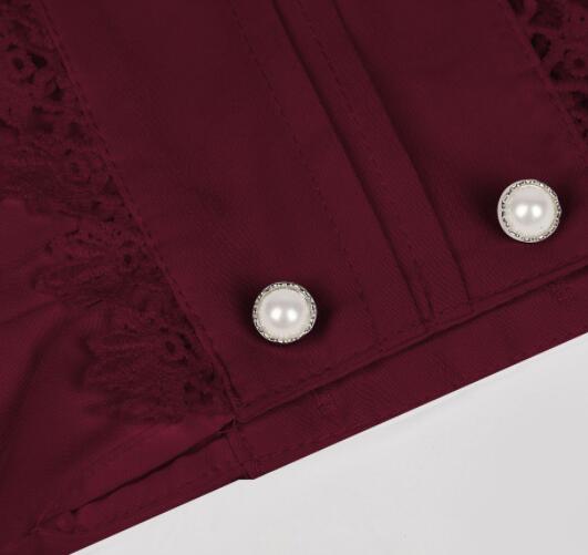 高襟デザインと胸元の繊細なレース装飾が上品な印象を演出します。