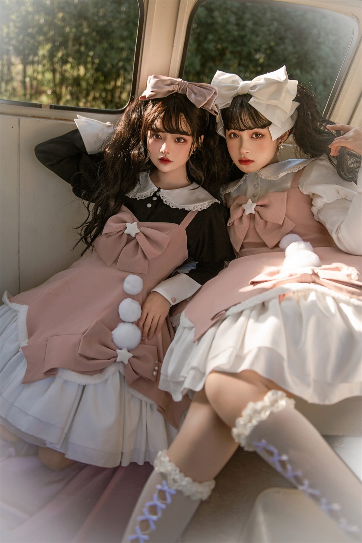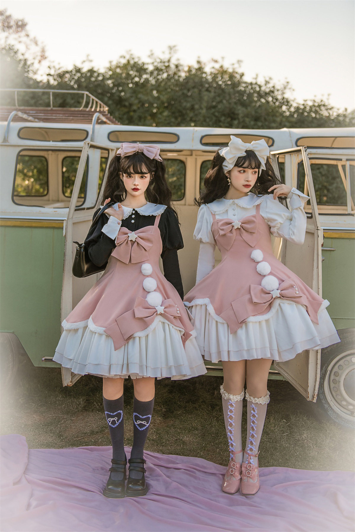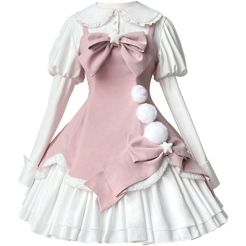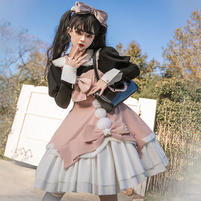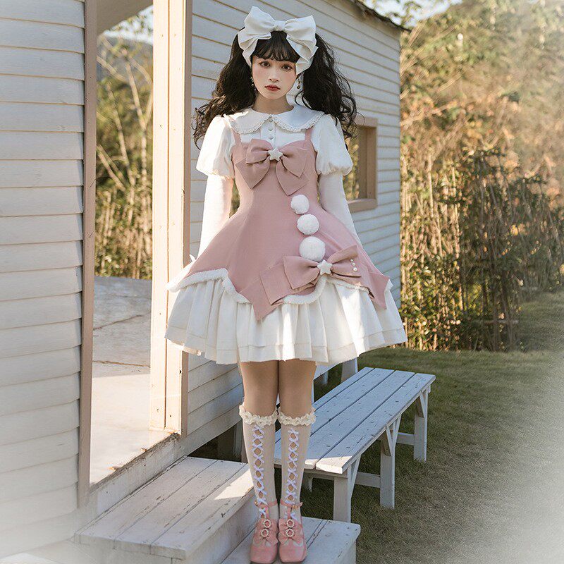 愛らしい丸襟のブラウスとジャンパースカートが一体になったロリータファッションのワンピースです。