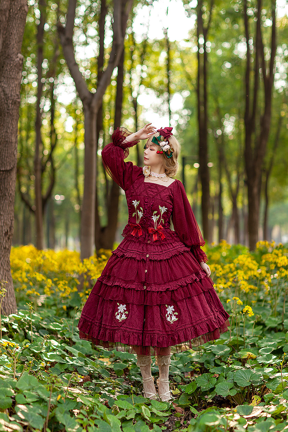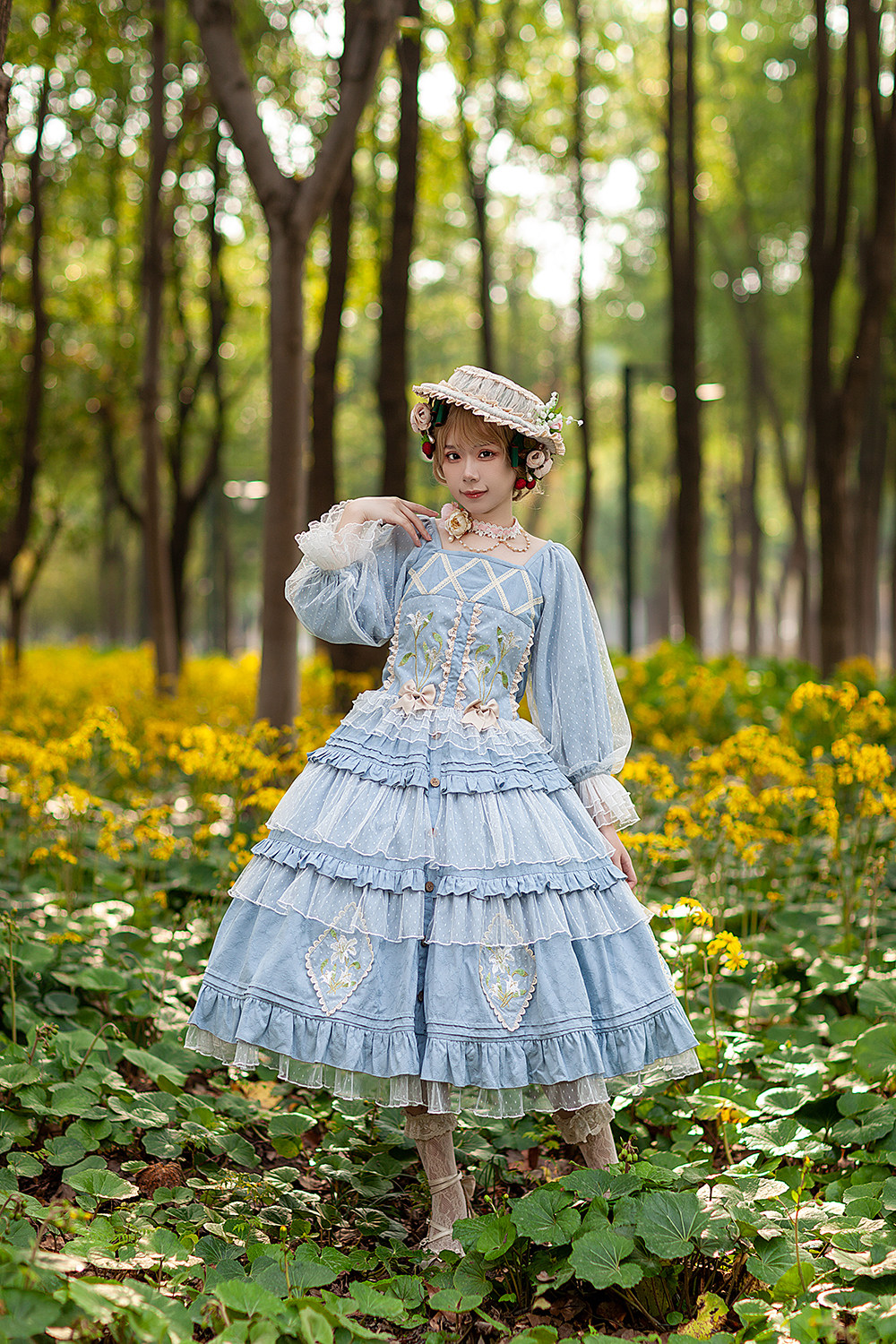胸元には繊細な花刺繍が施され、贅沢な段々フリルが幾重にも重なるスカートが特徴的です。