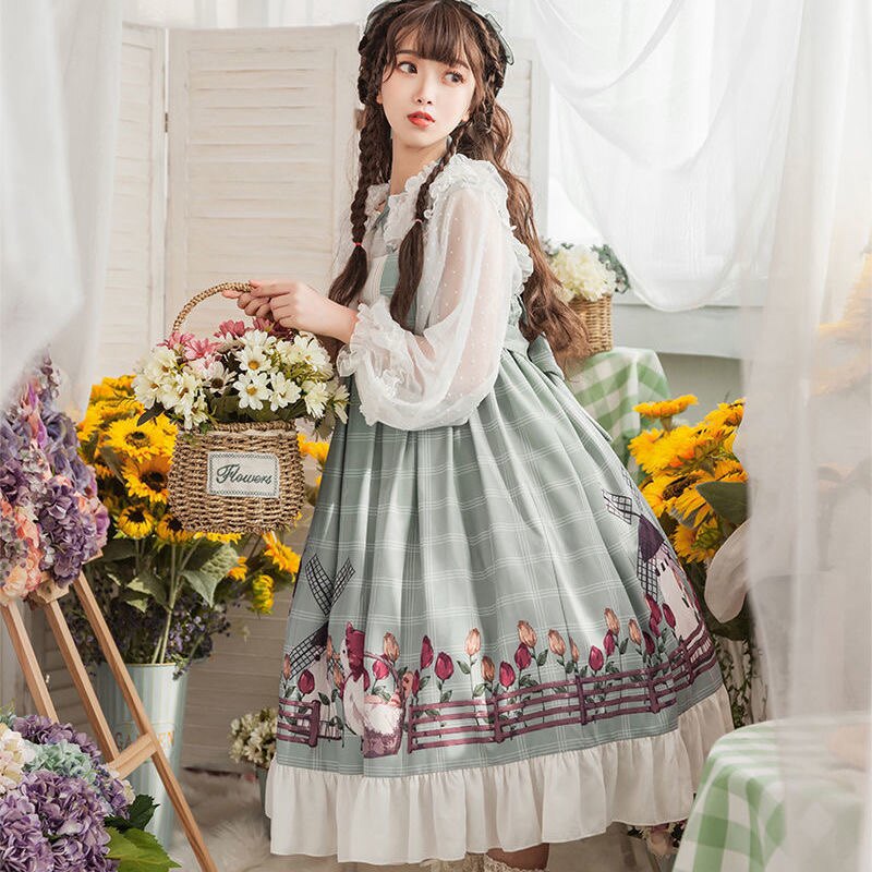 優雅なロリータファッションの世界を彩る、チェック柄のジャンパースカートと透け感のある長袖ブラウスのセットです。