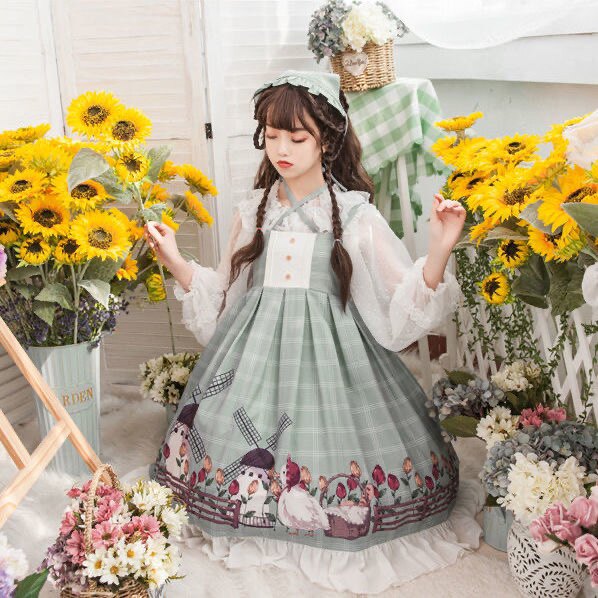優雅なロリータファッションの世界を彩る、チェック柄のジャンパースカートと透け感のある長袖ブラウスのセットです。 スカート裾には薔薇と柵の繊細な刺繍が施され、まるで秘密の花園にいるような雰囲気を演出します。 ハイウエストデザインで脚長効果も抜群、裾のフリルが歩くたびに優雅に揺れるワンピースです。 襟元のリボンと袖口のレースが可憐さを引き立て、特別な日のお出かけにぴったりの一着となっております。