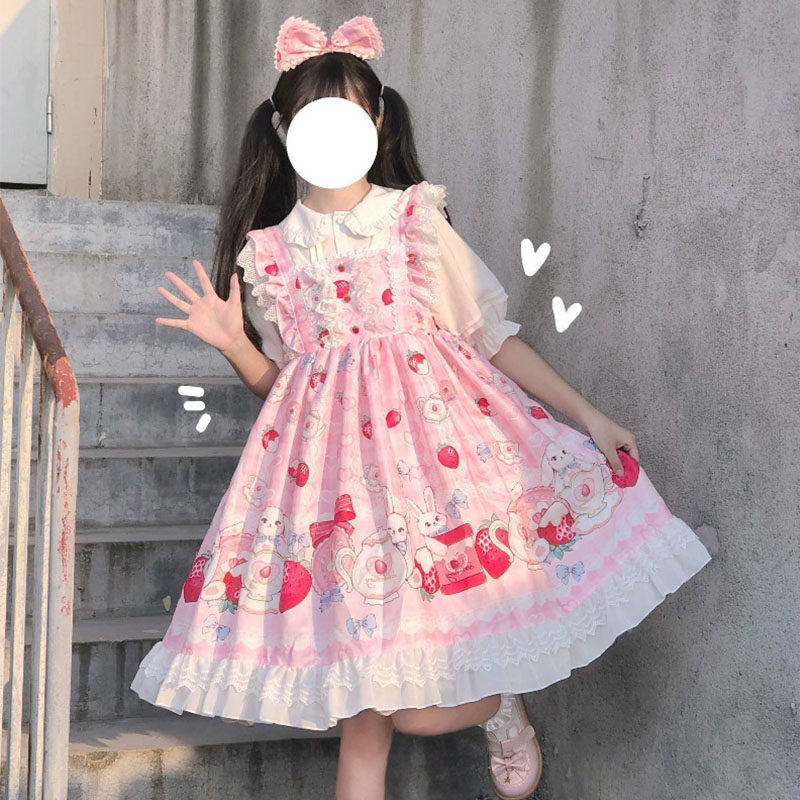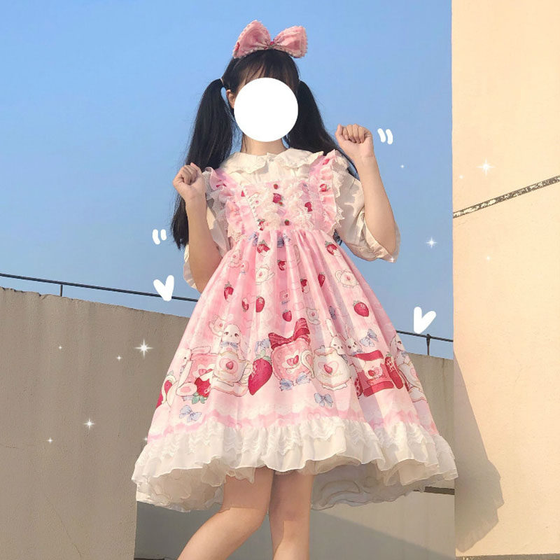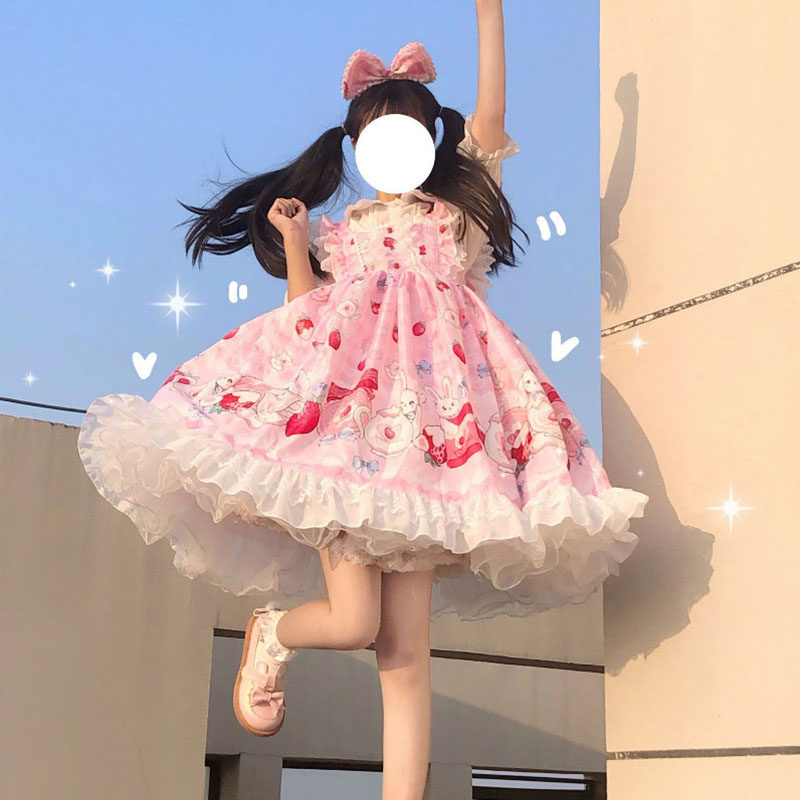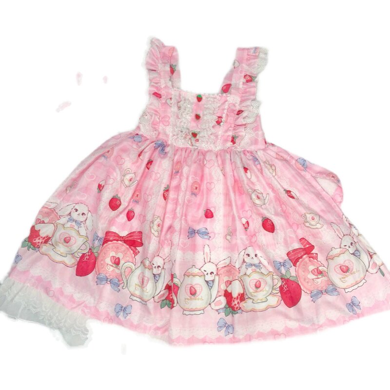 苺やうさぎのモチーフが散りばめられた華やかなプリント柄が特徴的で、ふんわりと広がるスカートのシルエットが乙女心をくすぐります。