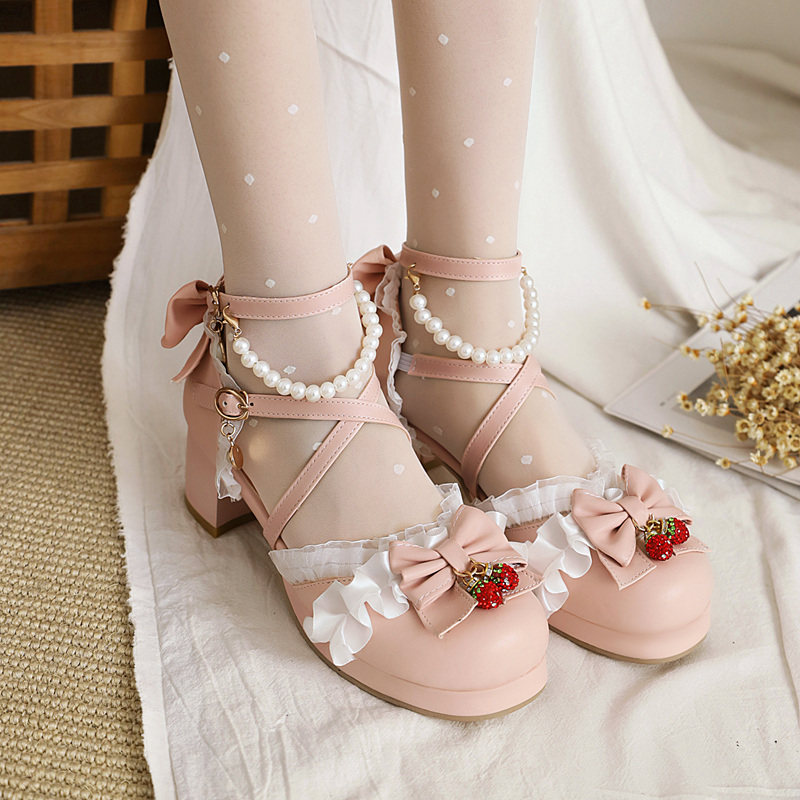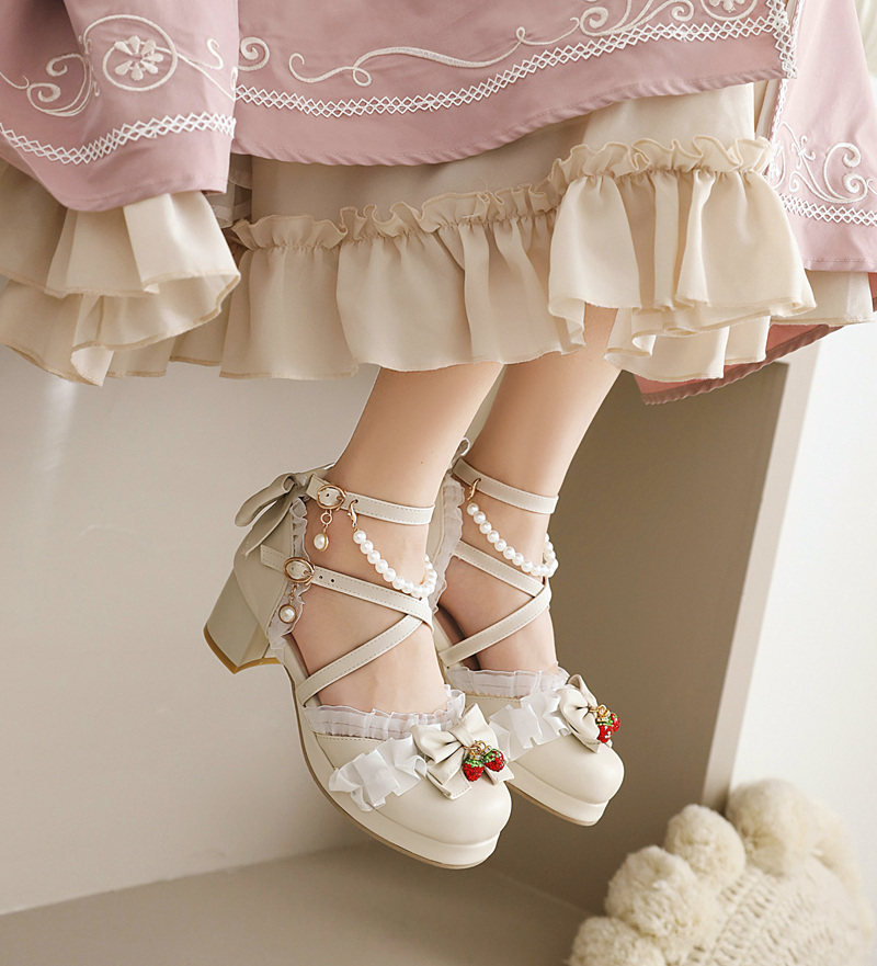 可憐な苺のチャームと華やかなフリルリボンが足元を彩る、夢見るような編み上げデザインの靴です。