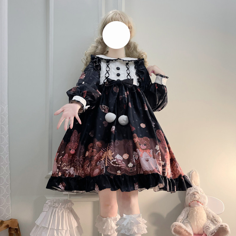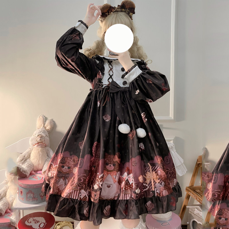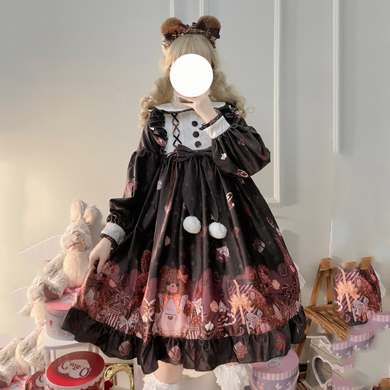 ロリータファッションの中でも特に人気のゴスロリテイストを甘く仕上げた夢見るワンピース。 裾にあしらわれた愛らしいくまさんやお菓子モチーフのプリント柄が乙女心をくすぐります。 たっぷりとしたギャザースカートとパフスリーブが優雅なシルエットを演出し、胸元の大きな襟とボタン装飾がクラシカルな雰囲気を際立たせます。 フリルを施した裾周りが華やかさをプラスした、特別な日にふさわしい一着です。