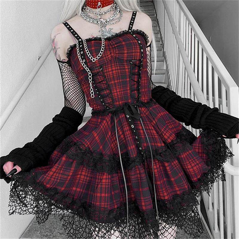 ビスチェ風のトップスに広がるスカートのシルエットが美しく、鎖のアクセサリーがパンクな雰囲気を演出します。