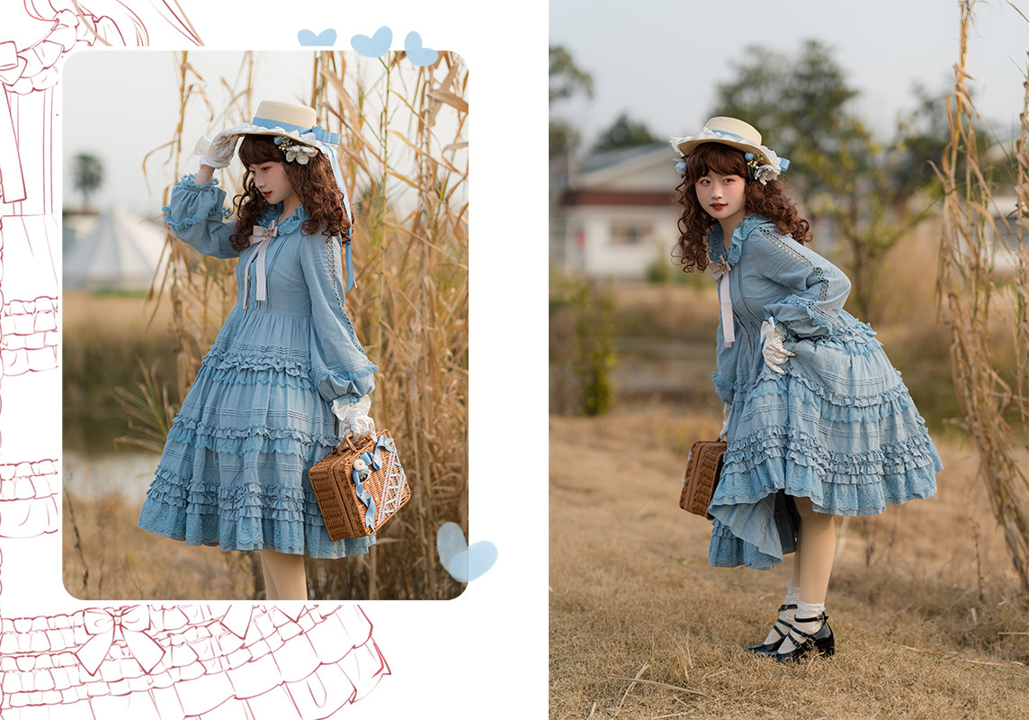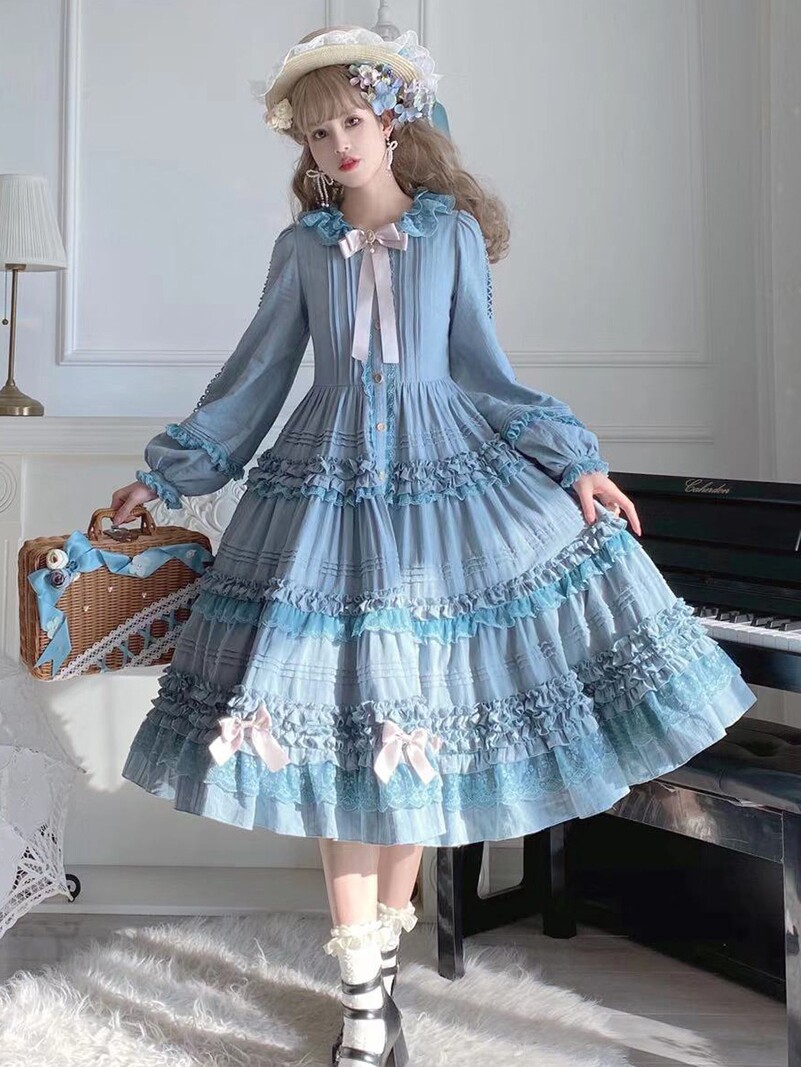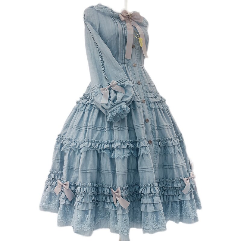 繊細なレース使いと胸元の大きなリボンが可憐な印象を演出し、袖口のギャザーと裾の多重フリルが優雅な雰囲気を醸し出します。