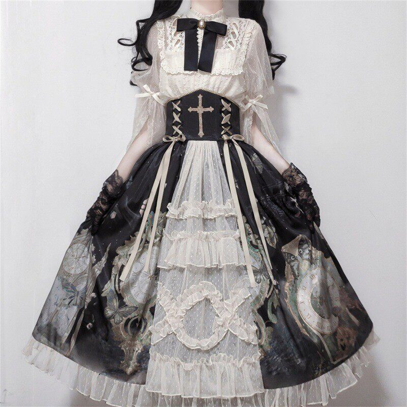 ロリータファッションの魅力が詰まったゴスロリワンピースです。 胸元の大きなリボンとレース襟が優雅な印象を演出し、十字架刺繍のコルセットベルトがウエストを美しく引き締めます。 多層に重ねられた繊細なレースフリルと幻想的な柄のスカートが、華やかさと神秘性を兼ね備えた逸品です。 袖口のリボンディテールも可愛らしく、特別な日のお出かけにぴったりな一着となっております。