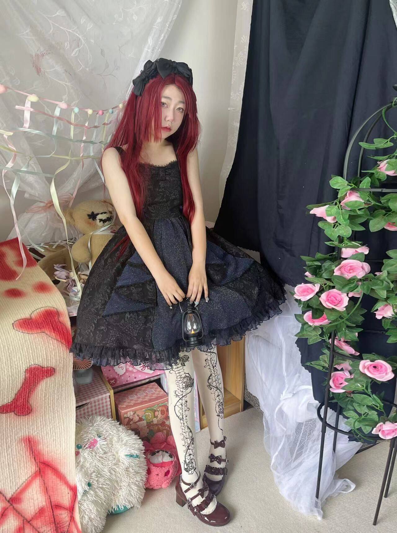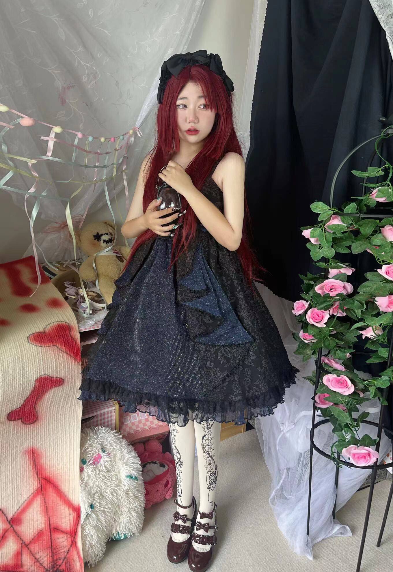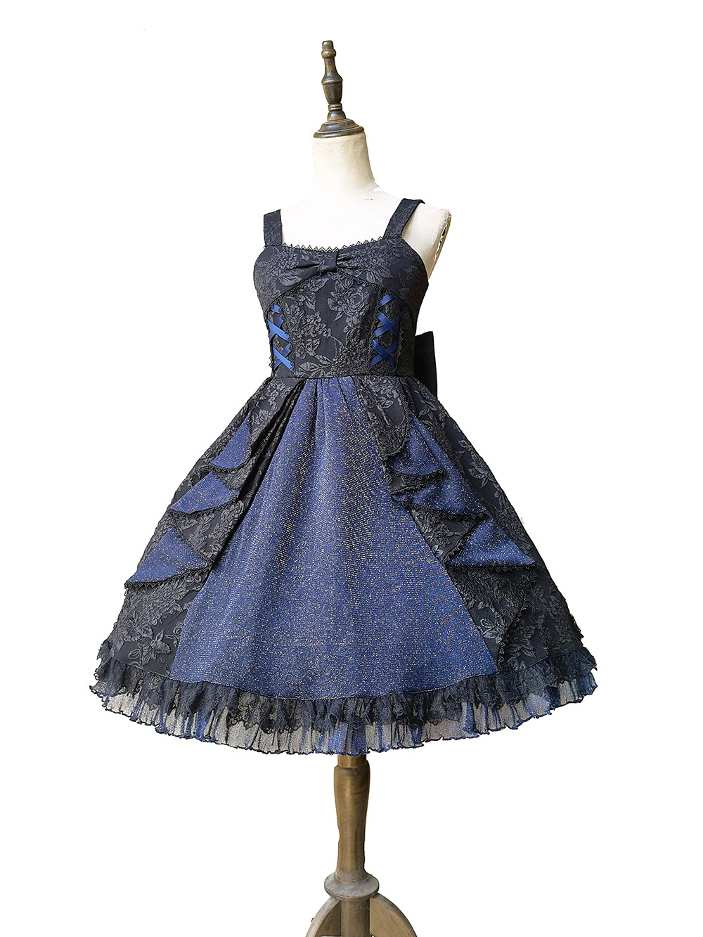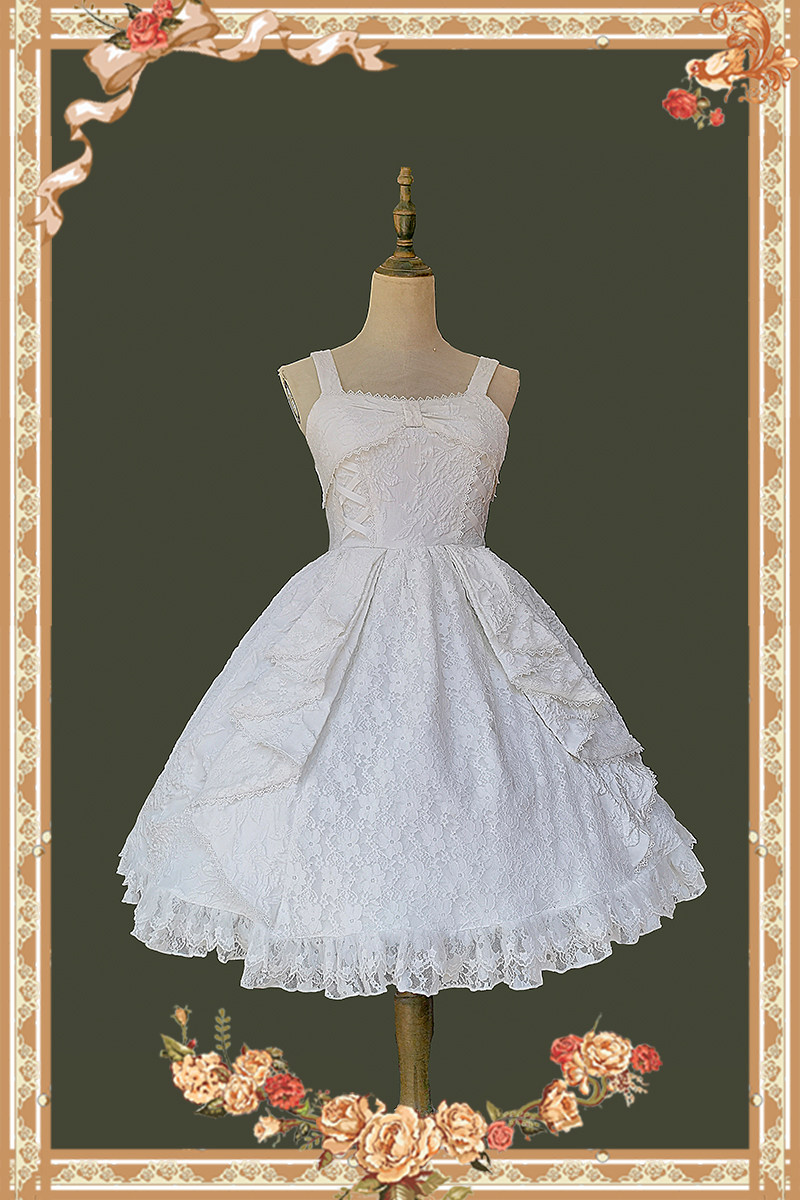 繊細なレース刺繍が全体を覆う、気品溢れるロリータファッションのドレスです。 胸元の編み上げデザインとスクエアネックが上品な印象を演出します。 ふんわりと広がるスカートには幾重にも重なるレースフリルをあしらい、優雅な動きを生み出します。 肩紐タイプで着脱も簡単、特別な日のお出かけから日常使いまで幅広く活躍する一着です。