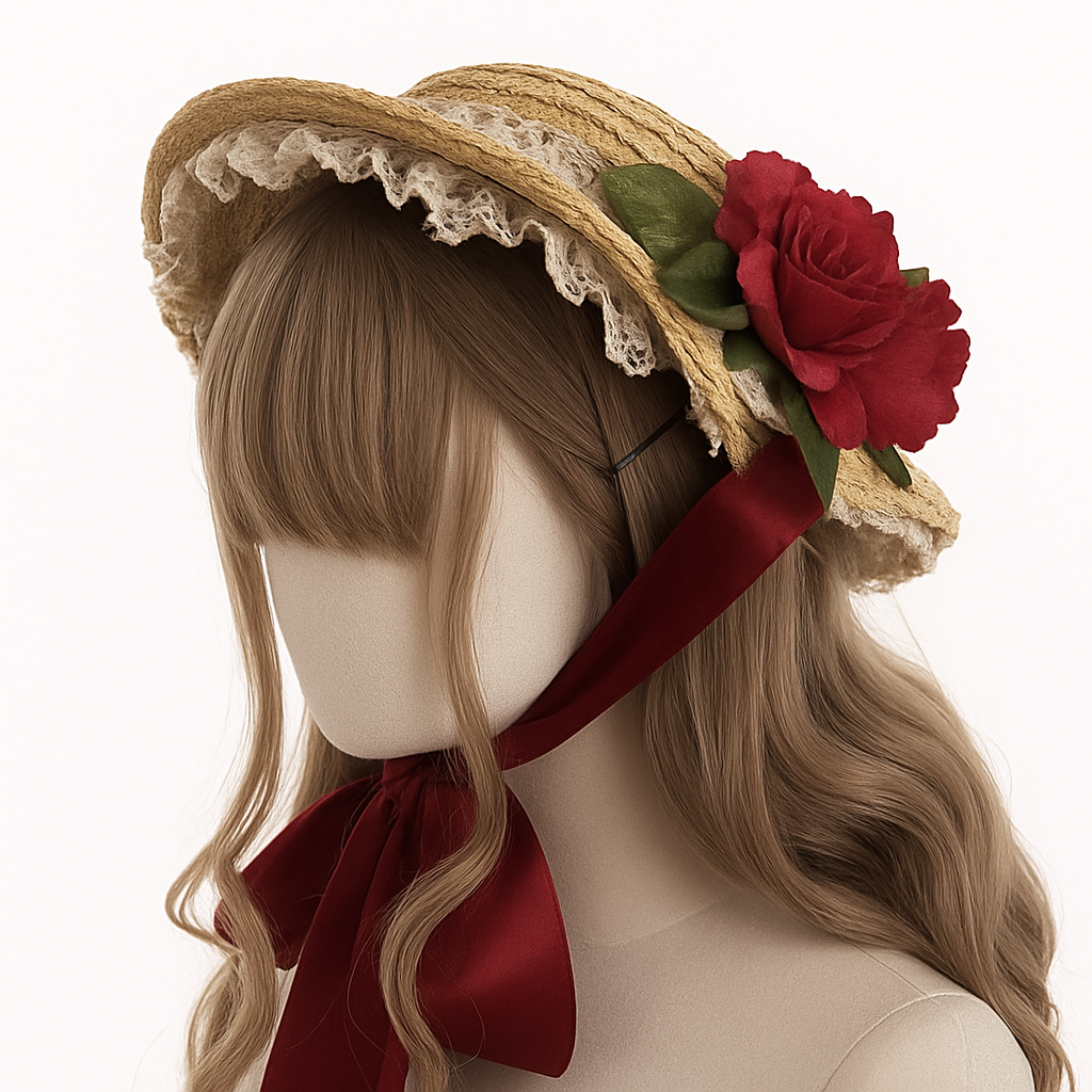 カラフルなリボンと大きなお花がアクセントになった、夏にぴったりな甘ロリータの麦わら帽子です。